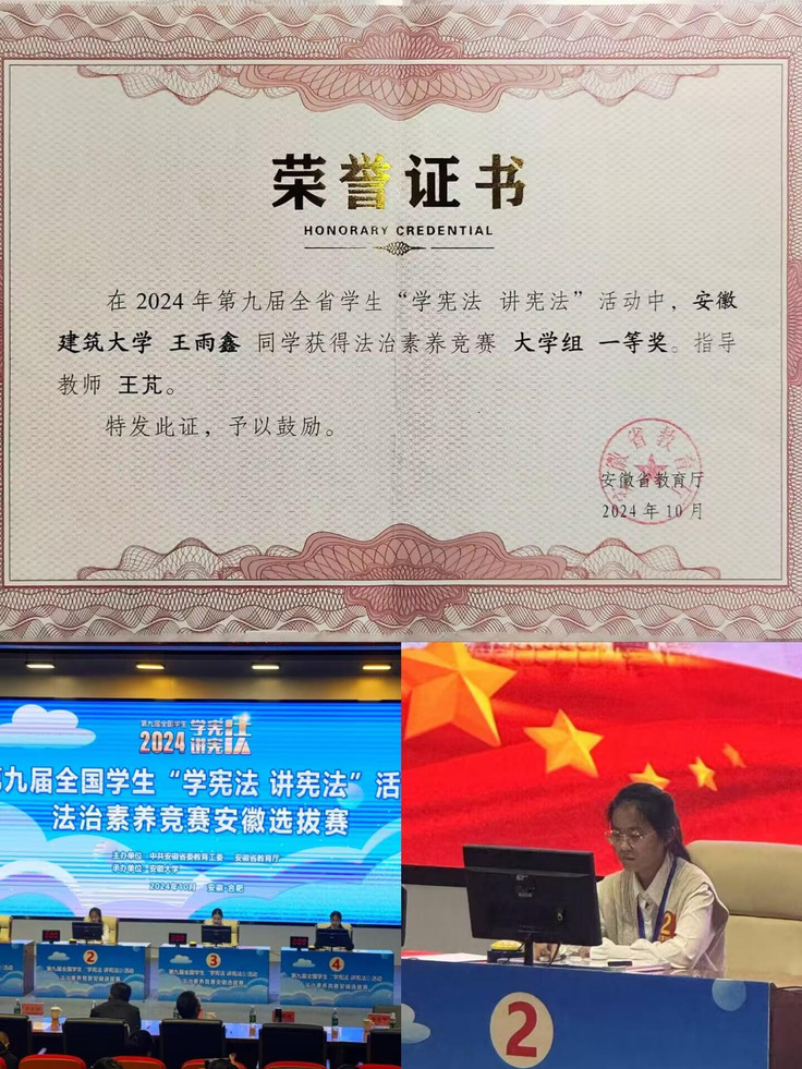 在夯实专业基础的同时,王雨鑫深知竞赛与实践是提升综合能力的重要途径。2024年,她报名参加第九届“学宪法 讲宪法”法治素养竞赛。备赛期间,她系统梳理宪法及相关部门法知识,反复研习历年真题,进行专门训练。从校赛的崭露头角到省赛的激烈角逐,每一轮比拼都是对知识储备和临场应变能力的考验。最终,她凭借扎实的专业功底和出色的现场表现,荣获省一等奖。此次经历让她的履历更加丰富,也为后续的保研竞争积攒了硬核实力。