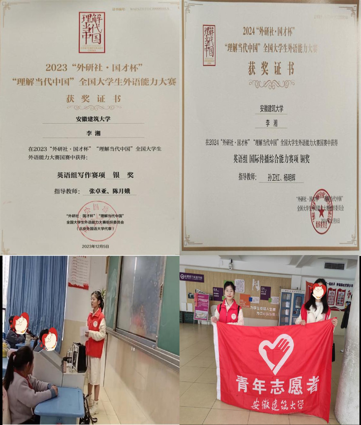 此外,李湘还积极投身社会实践,在志愿服务中践行青年担当。她曾作为志愿者参与小学支教,真切体验教师角色;加入事实无人抚养儿童陪伴计划,用温暖传递关爱;在中国女子篮球联赛(WCBA)合肥赛区担任志愿者,为赛事顺利进行保驾护航。这些经历让她走出书本,在实践中收获成长,更深刻理解了“新时代青年的使命与担当”。