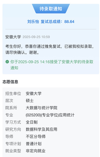 凭借优异的学业表现与丰富的竞赛经历,刘乐怡在保研选拔中脱颖而出。面对考研与保研的抉择,她最终选择主动争取推免资格,并全力投入院校申请与面试准备中。尽管一度因信息不足而焦虑、投递简历后迟迟未有回音,她仍坚持模拟面试、查漏补缺,保持积极心态。直至九月末,她终于收到心仪大学的录取通知。回顾这段历程,她鼓励学弟学妹勇敢尝试、专注自身节奏,相信每一份努力皆会在未来照亮前路。