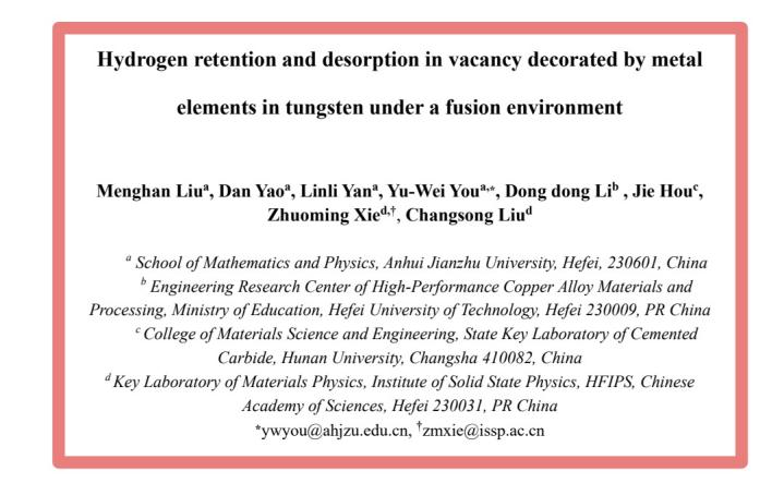 大二下学期,在同学的推荐下,她成功加入了学院的材料科研课题组,投身“过渡金属修饰对钨中空位缺陷中氢行为的影响”这一跨材料计算模拟领域的研究。从零接触VASP、Material Studio、Origin等专业软件,精读大量英文文献,在导师的悉心指导下开展计算模拟科研。科研之路并非坦途,每天抽出两三个小时做计算,日复一日,寒暑假也不松懈,一次次计算、一遍遍提交作业,培养了她严谨、耐心与抗挫折的科研品格。最终,她以第一作者身份将发表SCI一区论文,并在此过程中深刻体会到:“科研需要才智,更需要坚持与细致。”