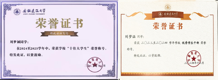 刘梦涵,中共党员,beat365官方网站数理学院声学专业2022级学生。在校期间,她始终以高标准要求自己,前三学年平均学分绩点3.85,取得专业第一的优异成绩。连续三年荣获学校一等学业奖学金,并获“十佳大学生及年度标兵”、“黄山奖学金”社会奖学金、“优秀学生干部”、“三好学生”等多项荣誉。她积极投身科研竞赛,将以第一作者身份发表SCI一区论文,在数学建模领域屡获各种奖项。凭借其卓越的综合表现,她获得声学专业唯一的保研资格,在推免中收获哈尔滨工程大学、合肥工业大学、三峡大学等多所高校的橄榄枝,最终勇敢选择跨专业保研至三峡大学电气工程专业,用扎实的步履书写了一段从声学到电气的跨界成长之旅。