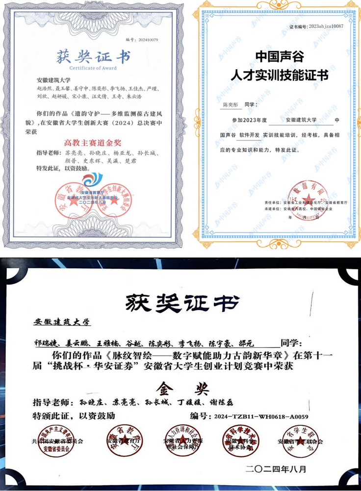 在各类高水平赛事中,她同样表现亮眼。备赛期间,她兼顾日常学业与竞赛打磨,主动承担统筹协调职责,与团队成员积极配合克服难题与挑战。在赛场答辩中,展现出极优的表达与应变能力。她与团队携手斩获安徽省大学生创新大赛总决赛高教主赛道金奖、第十一届“挑战杯”安徽省大学生创业计划竞赛金奖等重磅荣誉。此外,她主动把握技能提升机会,参与中国声谷软件开发实训技能培训,表现出色、顺利结业并夯实了专业技能。