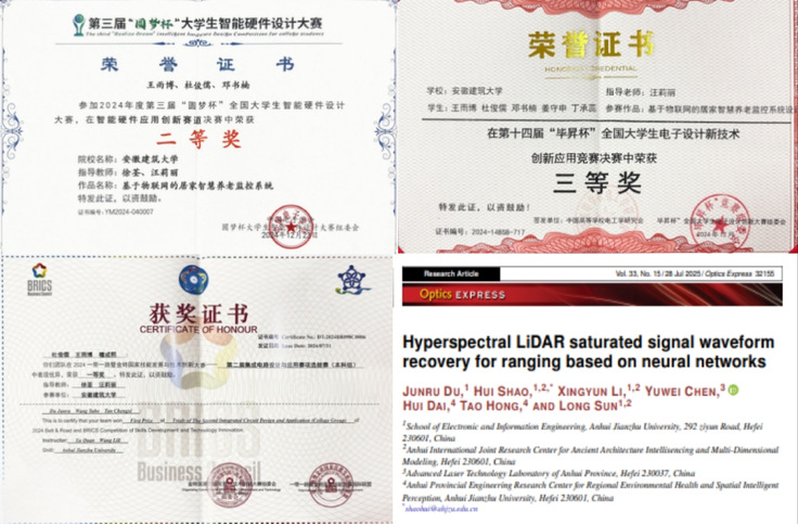 谈及科研,今年7月他以第一作者身份在光学领域国际权威期刊《Optics Express》(SCI二区)发表研究论文。该工作聚焦高光谱激光雷达中饱和回波信号的恢复问题。回忆起论文从构思到发表的全过程,他坦言:“这项成果绝非我一人之功,离不开老师的悉心指导和研究生学长的无私帮助。”正是在老师的引领下,杜俊儒初次系统接触科研方法,逐步建立起规范的学术思维与扎实的工程实践能力。从选题论证到算法实现,从数据验证到论文撰写,每一个环节都凝聚着邵老师的耐心点拨与严格把关。科研之路并非坦途,在论文投稿后的数月里,审稿意见等问题接踵而至。面对不确定性与高强度的工作压力,他没有退缩,而是选择沉下心来,逐个分点各个击破问题。他深知,真正的科研没有捷径,唯有日拱一卒的坚持与脚踏实地的积累。正是这份韧劲与责任感,支撑他最终完成了这项具有创新价值的工作。