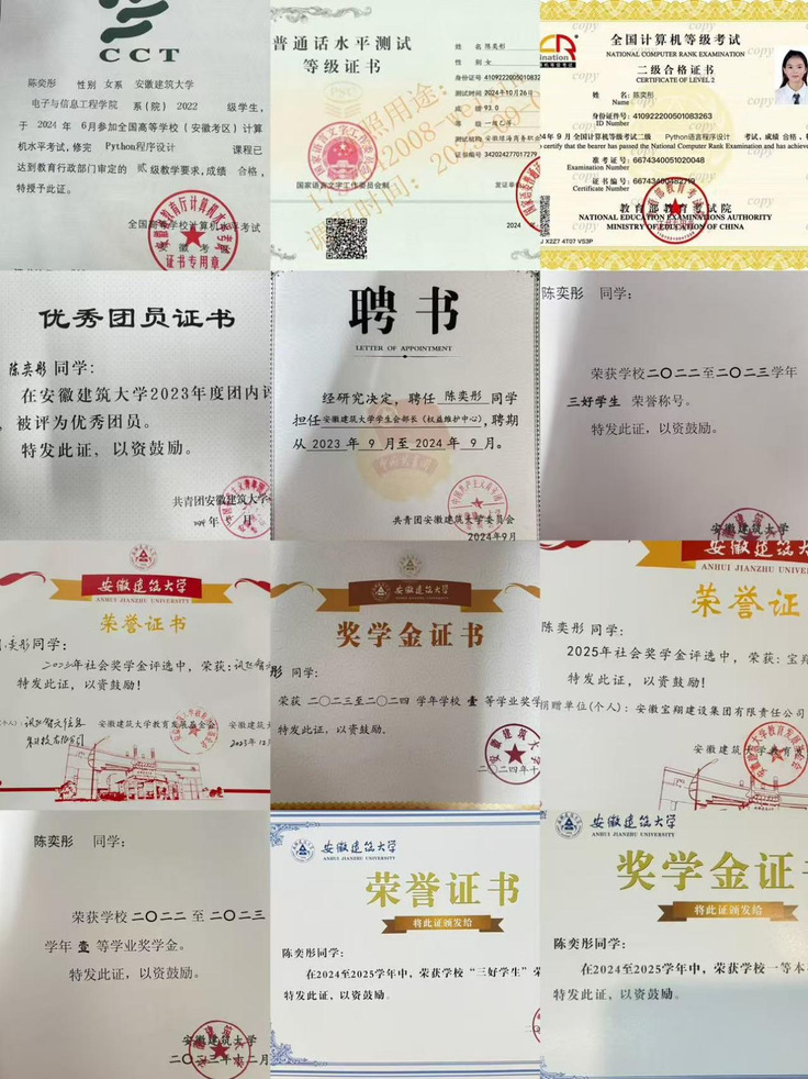 初入大学,陈奕彤便明确了深耕专业、冲刺深造的目标,将学习置于核心地位。她深知建筑电气与智能化专业兼具理论深度与实践要求,唯有脚踏实地方能行稳致远,始终保持着良好的学习习惯和高效的学习方法。除学好课程知识外,她不断提升综合技能,一次性通过英语四六级、计算机二级考试,考取普通话一级乙等证书,并掌握CAD、Revit、Python、C语言、MATLAB、组态王等实用软件,用扎实的学业成果为保研之路筑牢根基。