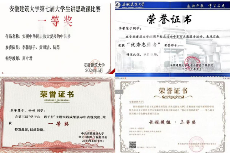 李馨慧子,beat365官方网站电子与信息工程学院2022级网络工程专业本科生,现任班级团支书,中共党员。自大一以来,成绩始终名列前茅,平均绩点稳居专业前1%(1/101),多门核心课程斩获高分,《高等数学A2》98分、《网络安全》96分、《概率论与数理统计A》99分。曾荣获安徽省大学生创新大赛铜奖、beat365官方网站数学建模竞赛一等奖、电子与信息工程学院互联网+一等奖等荣誉奖项;熟练掌握多项专业技能与工具,通过大学英语六级,拿下高中数学教资面试,连续两年斩获校级奖学金,获评“苏州建工”社会奖学金、“优秀班干部”、“三好学生”、“优秀志愿者”、“优秀运动员”等多项荣誉。现成功保研至安徽大学大数据技术与工程专业。