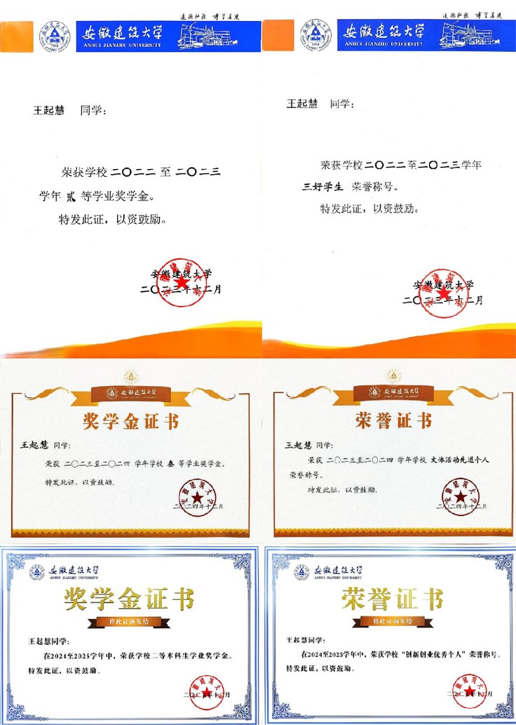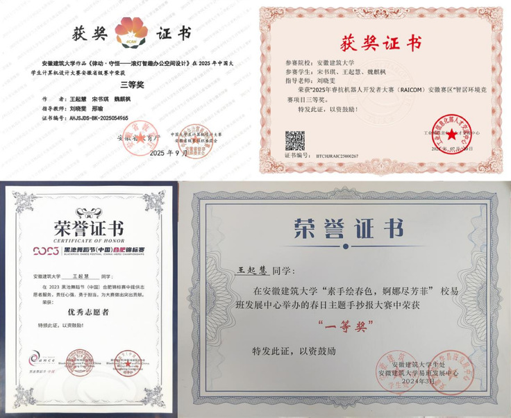 如果说专业学习是一步一个脚印,那么竞赛与实践便是王起慧成长路上的璀璨绽放。她深知,设计不仅需要扎实的专业功底,更需要开阔的视野与协作能力。大三下学期,她携手团队参加中国大学生计算机设计大赛和睿抗机器人开发者大赛(RAICOM)。备赛期间,从最初的创意构思到模型搭建,再到方案的反复沟通与优化,她始终全程参与、全力投入。最终,两支参赛队伍均斩获省级奖项,用实力证明了付出的价值。