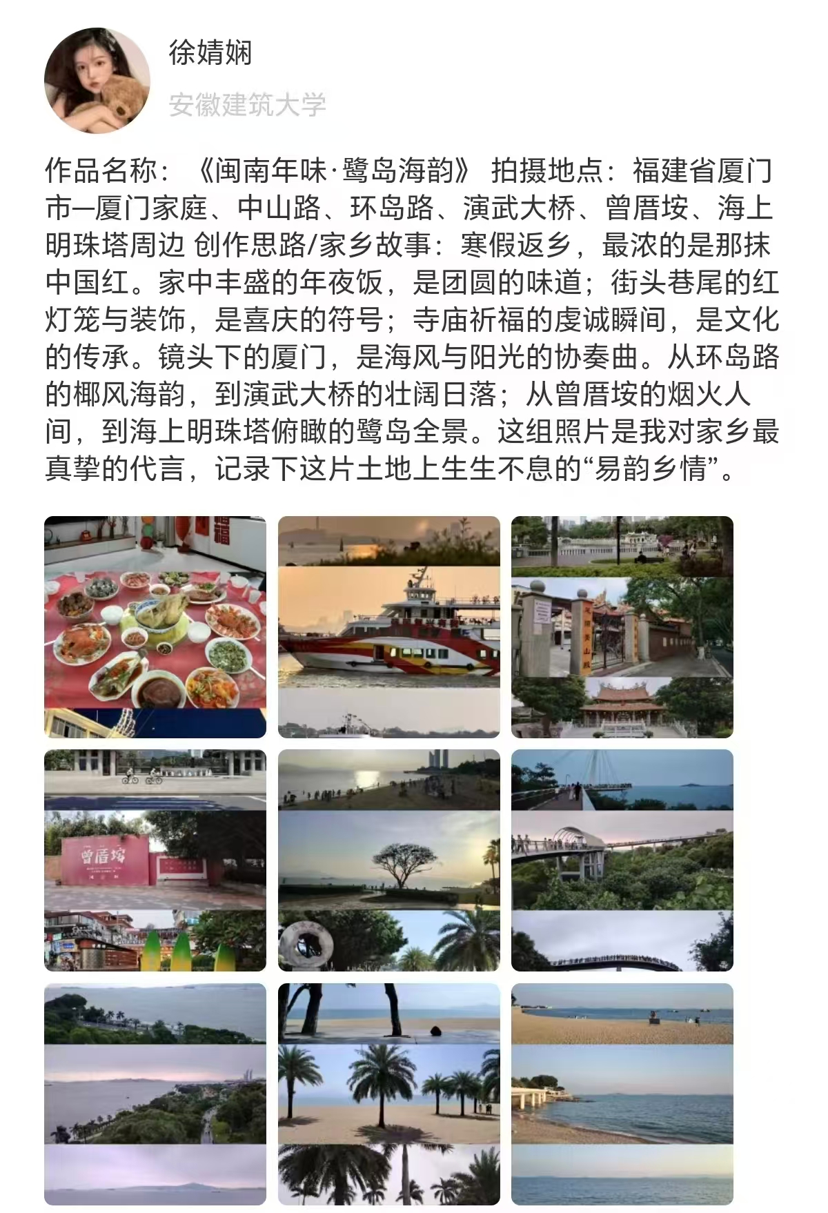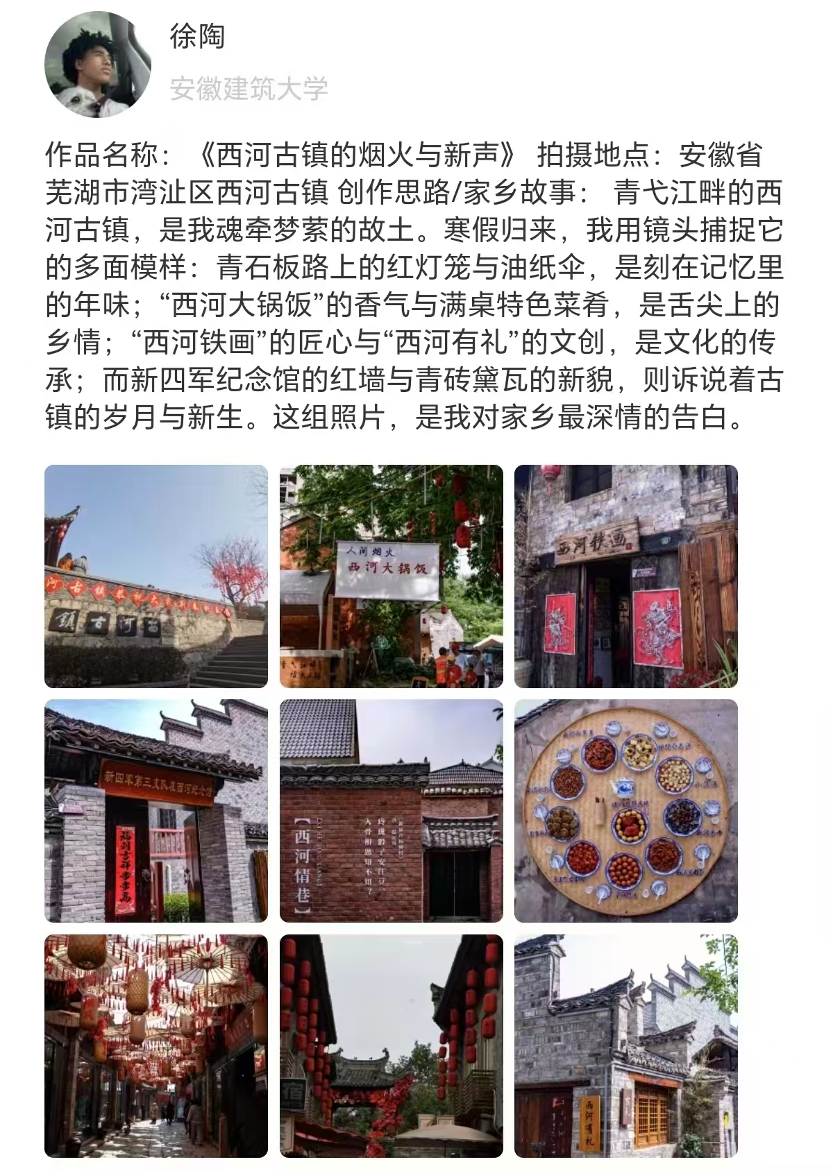 本次活动依托“易班·今日校园”平台线上开展,本届大赛一经启动便得到各学院同学的积极响应,共征集优秀摄影作品80余件。在同学们的镜头和笔墨下,家乡的美被多元诠释:既有皖南古村的白墙黛瓦、皖北平原的辽阔苍茫等自然风光,也有非遗传承人的匠心坚守、邻里团圆的烟火温情等人文风情,更有家乡新建成的产业园区、畅通的乡村道路、焕新的民生工程等发展新貌。这些作品兼具思想性与艺术性,充分彰显了建大学子对家乡的深厚热爱,以及对时代发展的敏锐洞察。作品征集截止后,校易班发展中心与机电学院易班工作站依据综合平台点赞量、专业评审意见等,评选出各等级奖项及优秀奖,并为获奖选手颁发荣誉证书与奖品。