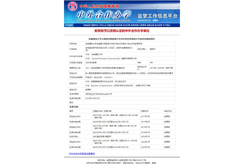 本网讯 近日,安徽省教育厅转发教育部国际合作与交流司《关于部分高校申请变更中外合作办学项目及内地(大陆)与港澳台合作办学项目申请变更事项的批复》(教外司办学[2022]53号),beat365官网与美国中密歇根大学合作举办的环境设计(室内设计)专业学士学位教育项目变更申请成功获批。