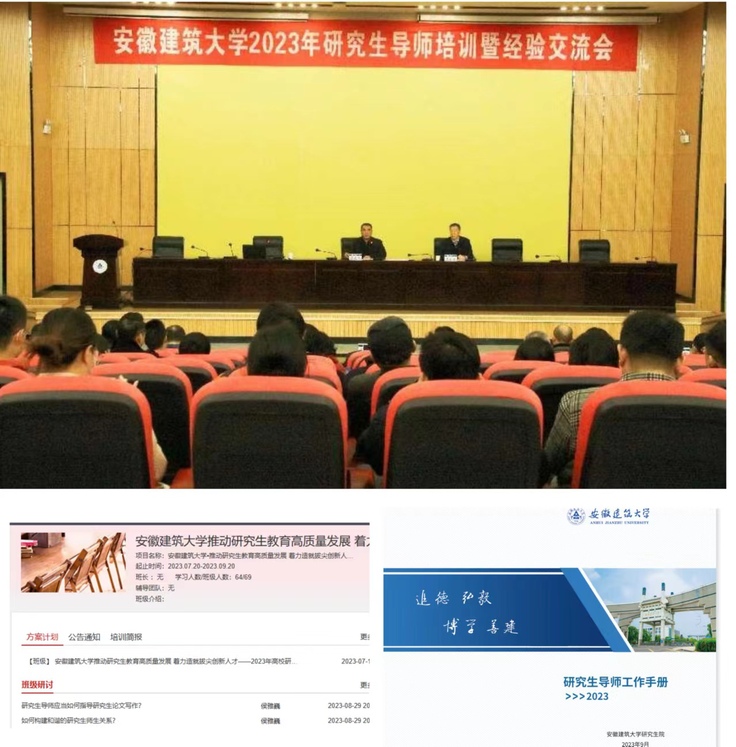 加大培训力度,提升导师综合育人能力。2023年,首次编制《研究生导师手册》,发挥手册“工具书”作用,为导师全面了解国家、学校有关研究生教育政策和规章制度做重要参考。实施导师能力提升计划,强化导师立德树人职责。以“推动研究生教育高质量发展着力造就拔尖创新人才”为主题,组织新遴选的69名新晋导师开展2023年研究生导师网络培训;组织研究生导师近200人召开线下研究生导师培训暨经验交流会,通过专题报告、主题交流的形式提升导师育人素养、能力和水平,落实研究生导师立德树人职责要求。