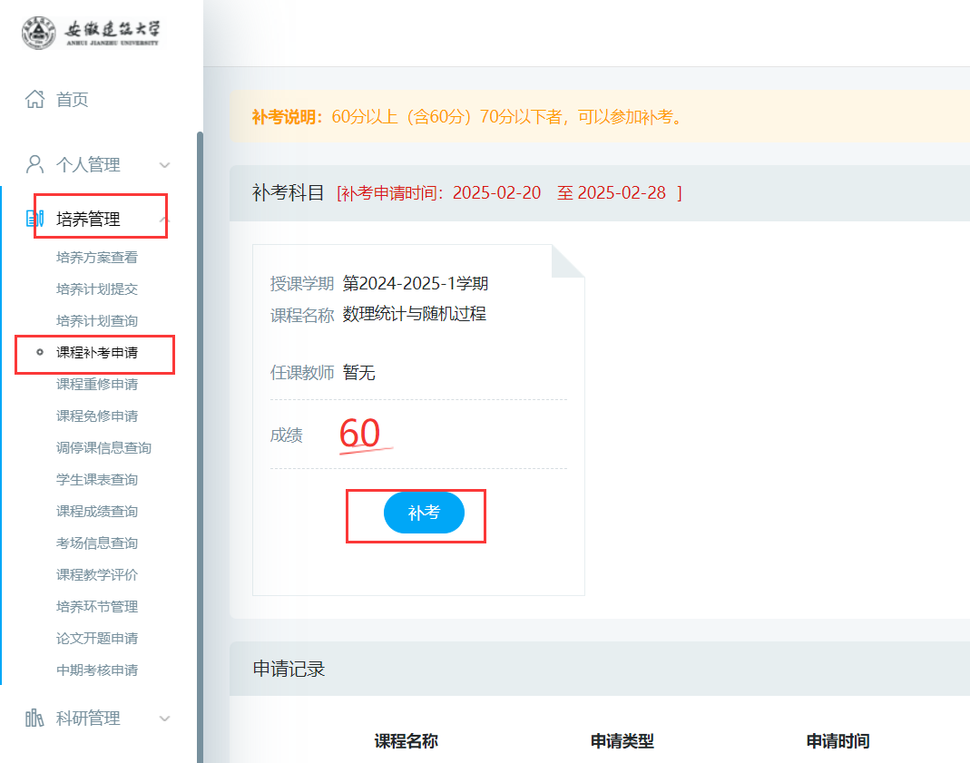 根据研究生院学期工作安排,2024-2025学年第二学期全日制硕士研究生期初补考安排如下,请各位需要补考的研究生,首先在研究生教育管理申请补考,未在系统申请补考的学生,无补考成绩。重修课程为本学期能开设的课程,请在2月28号前在系统里申请,具体补考、重修申请如下: