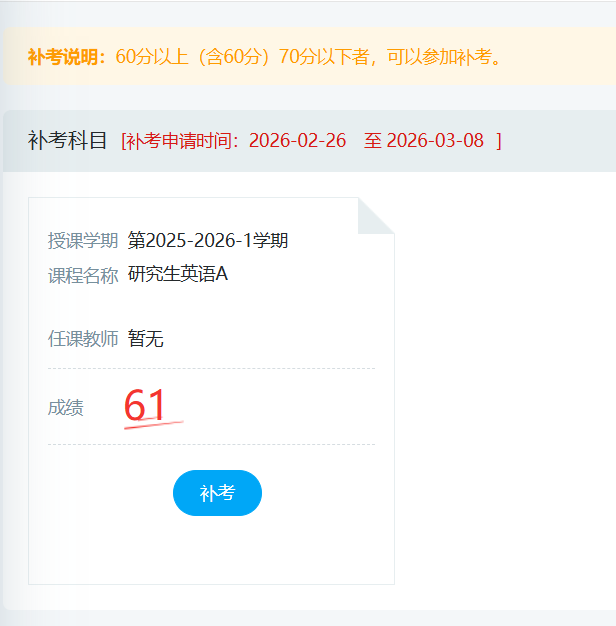 根据研究生院学期工作安排,2025-2026学年第二学期全日制研究生期初补考安排如下,请各位需要补考的研究生,首先在研究生教育管理申请补考,未在系统申请补考的学生,无补考成绩。重修课程为本学期能开设的课程,请在3月8号前在系统里申请,具体补考、重修申请如下: