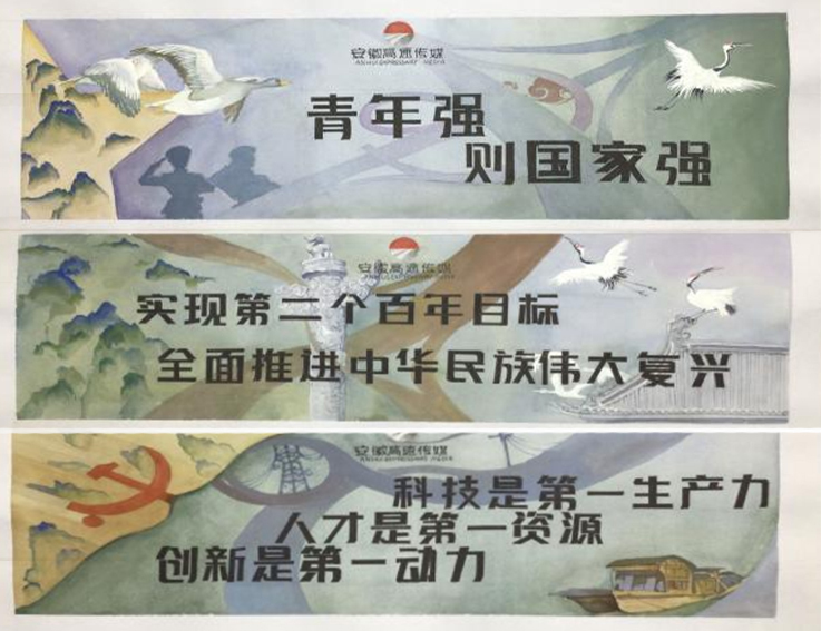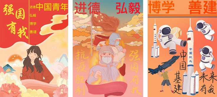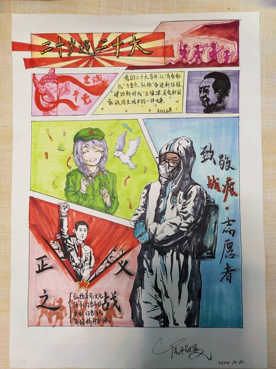 崔程媛与谢方雨同学以海报为创作主题,表达了坚定革命理想信念,坚持不懈,砥砺奋斗, 努力做好新时代青年,自觉担当起责任使命,为建设中国梦贡献一份力量的决心。