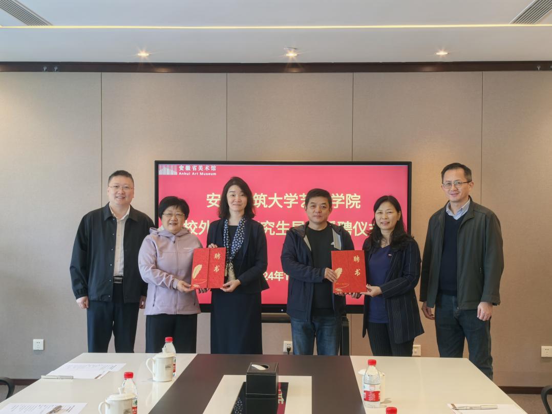本网讯 11月6日上午,艺术学院研究生校外导师受聘仪式暨研究生联合培养交流座谈会在安徽省美术馆一号会议室举行,会议由艺术学院副院长(主持工作)邢瑜主持。艺术学院党委副书记(主持工作)潘青、副院长黄朝晖、科学技术处(产学研合作办公室)副处长洪涛共同为安徽省美术馆副馆长刘文杨、安徽省美术馆学术交流部主任张耕、安徽省书画院副院长陈明哲颁发了研究生校外导师聘书。