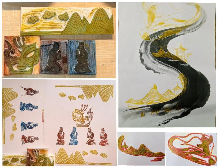 同学们充分发挥巧思与创意,以利落简练的线条,生动刻画高铁穿梭于山河、火箭直冲云霄的壮阔时代图景,定格国家发展的铿锵步伐;以细腻入微的刀工,精心雕琢故宫飞檐的精巧弧度、敦煌飞天的飘逸衣袂,让传统建筑的恢弘与古典艺术的灵动在橡皮上重现。同学们将华表、祥云等吉祥元素与现代城市剪影巧妙融合,让时代脉搏与文化瑰宝在刀起刀落间完美交融。大家在橡皮上精准勾勒轮廓、细化纹路,手持刻刀小心翼翼雕琢,聚精会神处理每一处细节,让图案在指尖逐渐成型。完成刻制后,以金色、朱红等寓意喜庆祥和的颜料精心上色,更通过单枚印章重复盖印形成整齐纹样、手写“国泰民安”“盛世繁华”等吉祥字句点缀、多块不同图案的橡皮章拼接组合成完整画卷等多样方式,让印绘作品更显丰富立体、意蕴悠长。