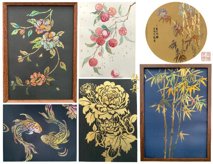 学院举办“金箔承文脉,匠心耀盛世”金箔画创作活动,让学生亲身体验非遗技艺的当代传承。同学们积极探索“烧箔”技法,通过火候控制呈现流光渐变的效果;或以金箔为底,辅以工笔描绘,让敦煌飞天的衣袂点缀熠熠星光;更有将金箔剪裁叠贴,塑造锦鲤鳞片与竹节纹理,再施以淡彩晕染,实现金属质感与自然意象的和谐相融。以金箔为媒、以画笔为翼,在亲手实践中建立起学生对传统文化的情感认同与文化自信,成为“以美育人、以文化人”的鲜活载体。