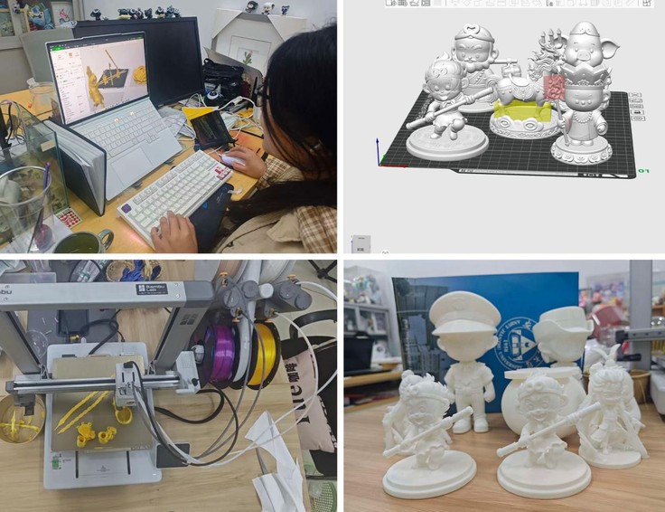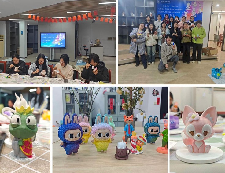 活动以“数字成型,手工赋魂”为主线,以经典动画角色为创作对象,通过三维建模、打印优化、实体输出等环节完成素模制作。同学们在技术实现与艺术表达之间建立联结,体验从数字设计到实体创作的过程。在手工彩绘环节,同学们为白色模型赋予个性色彩与情感表达,生动诠释了主题中“一千种可能”的开放性内涵。通过结构化、可操作的创作流程,亲历了从数字蓝图到实物成果的完整转化,加深了对设计跨媒介、跨流程特点的理解。