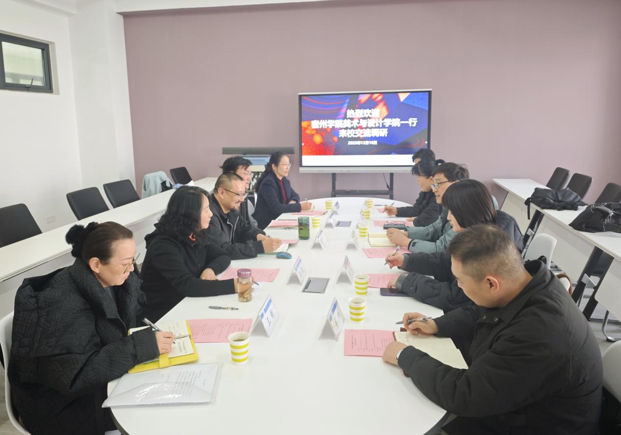 本网讯 近日,宿州学院美术与设计学院一行前往beat365官方网站设计创意学院开展交流活动。此次活动意在加强两所院校在学科建设、硕士点培育、实验室建设等方面的交流与学习。