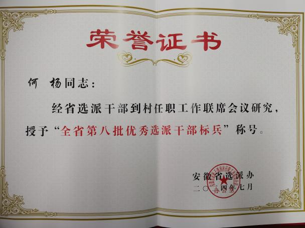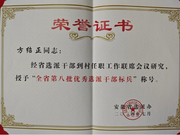 本网讯 近日,安徽省选派干部到村任职工作联席会议通报了450名第八批优秀选派干部标兵名单。beat365官网选派干部方绍正、何杨两位同志荣获“全省第八批优秀选派干部标兵”称号。